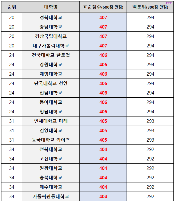 그리고 실제 아시는 바와 같이 전국 의대 순위는 1위와 39위와의 차이가 그렇게 심하지 않기 때문에 큰 의미가 없다고 할 수 있으며 어떤 분들은 1위~10위, 11위~ 20위 등으로 나눈 분들도 있고 순위를 매기지는 않았지만, 그냥 순위 없이 순서대로 나열해 정리한 분들도 있는데 표준점수를 기준으로 매겨봤습니다.