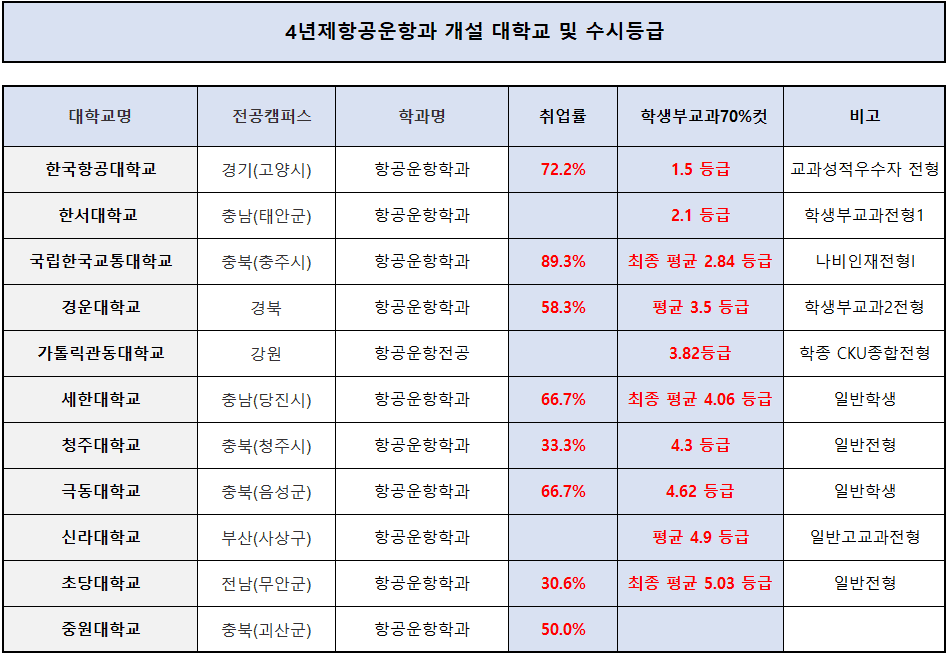 ▣ 항공운항학과 개설 대학 수시등급 및 취업률 순위 ▣