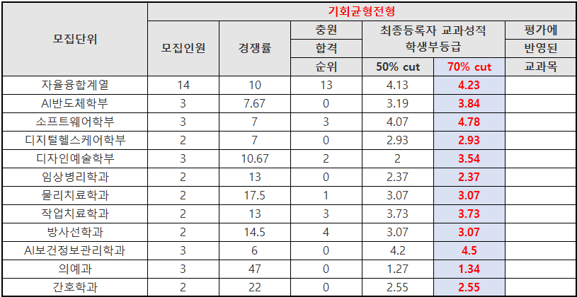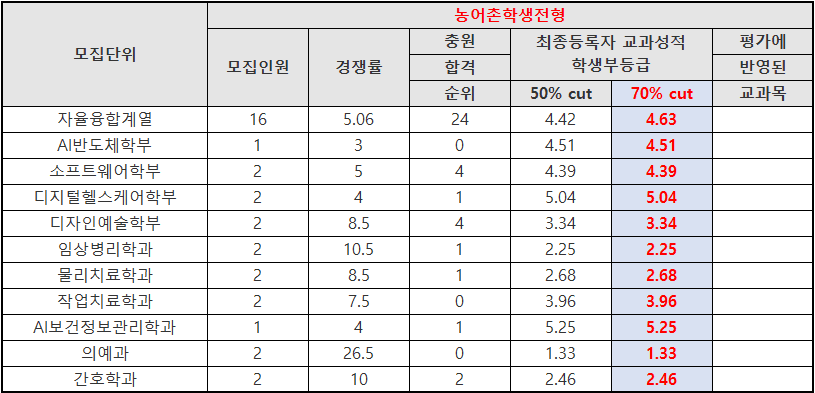 모집단위별 수시 입결을 보면 자율융합계열은 246명 모집에 2.95:1 경쟁률에 최종등록자 70%컷 4.68등급에 충원합격 순위 51번이 합격을 AI반도체학부는 17명 모집에 3.88:1 에 4.96에 빠진 예비가 없는 것으로 확인됩니다.