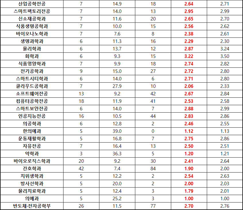 컴퓨터공학전공은 35명 모집에 48.3:1 에 4.15, 5.00등급에 7번이 스마트보안전공은 13명 모집에 33.4:1 에 4.49, 5.00 에 7번이 인공지능전공은 35명 모집에 35.4:1 에 4.48, 5.21등급에 추합 예비순위 4번이 합격이었습니다.