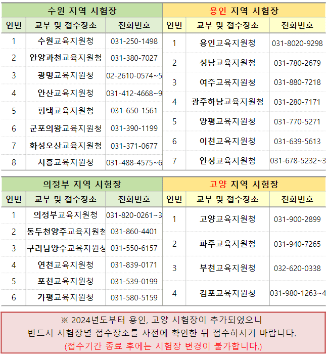 현장접수 직접 찾아가셔서 해야 하며 서울시는 서울공업고등학교 (02-826-8922)에서 실시하며 경기도는 각 교육지원청에서 가능한데 예를 들어 수원 지역 시험장을 이용하게 되면 수원교육지원청, 안양과천교육지원청, 광명교육지원청, 안산교육지원청, 평택교육지원청, 군포의왕교육지원청, 화성오산교육지원청, 시흥교육지원청에서 접수하셔야 합니다.