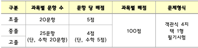 초졸은 과목별 문항 수 20문항에 문항 당 배점 5점을 중졸, 고졸은 25문항(단, 수학 20문항)에 4점 (단, 수학 5점)이며 문제형식은 객관식 4지 택 1형 필기시험으로 보게 됩니다.