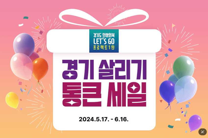 경기도 민생회복 LET’S GO 프로젝트 1탄으로 경기 살리기 통큰 세일을 2024년 5월 17일부터 6월 16일 까지 진행 합니다. 행사 내용으로는 도내 로컬푸드 직매장 78개소서 농산물 구매 시 10% 할인, 마켓경기에서 제철과일 구매 시 30%~ 20% 할인을 합니다.