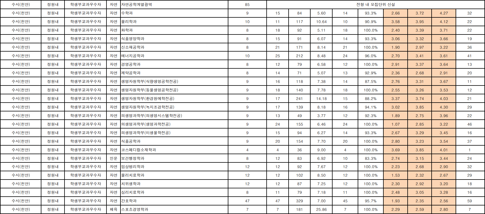 수학과는 15명 모집에 84명이 지원해 5.60:1에 3.72등급에 32번이 물리학과는 11명 모집에 117명이 지원해 10.64:1 에 3.95에 22번이 단국대 천안캠퍼스 수시등급 화학과는 18명 모집에 92명이 지원해 5.11:1 에 3.39등급에 22번이 최종합격 된 걸로 확인됩니다.