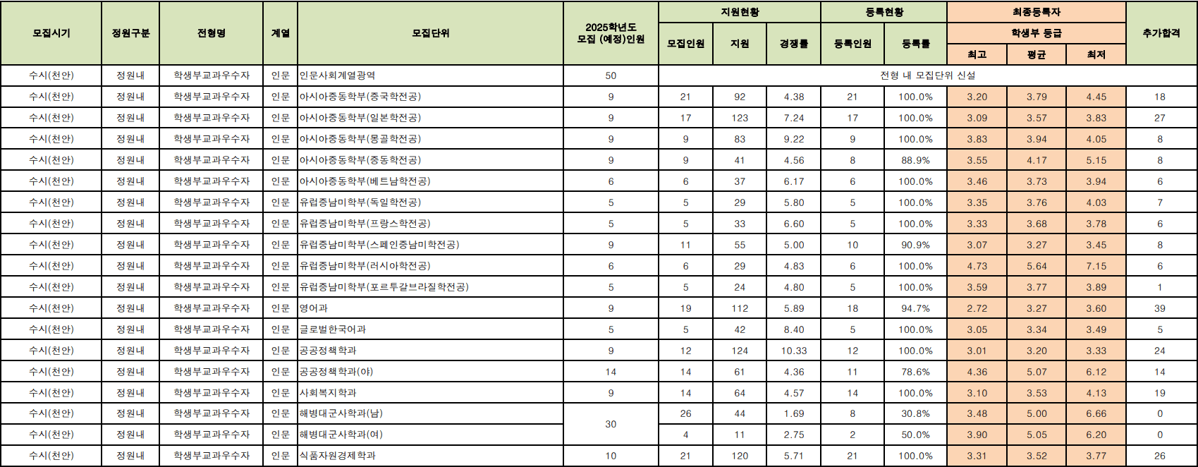 모집단위별 입결을 보면 영어과 13명 모집에 117명이 지원해 9.00:1에 학생부 평균 3.70등급에 추가합격 16번이 글로벌한국어과는 4명 모집에 37명이 지원해 9.25:1 에 4.29등급에 1번이 공공정책학과는 10명 모집에 120명이 지원해 12.00:1 에 3.70 에 11번이 합격처리되었습니다.