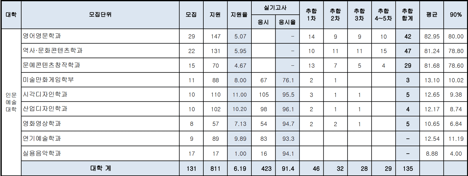 영화영상학과는 8명 모집에 57명이 지원해 7.13:1 에 10.65 에 5번이 연기예술학과는 9명 모집에 89명이 지원해 9.89:1 에 12.54 에 빠진 예비가 없는 것으로 실용음악학과는 17명 모집에 17명이 지원해 1.00:1 에 8.88 에 결과였습니다.