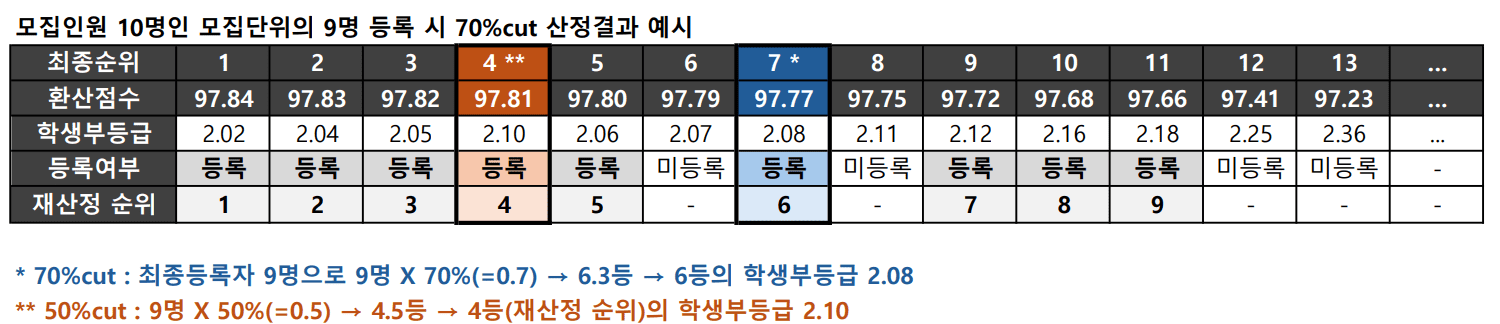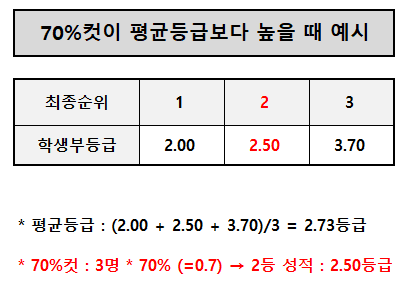 만약 최종등록자 3명 성적이 1위 2.00, 2위 2.50, 3위 3.70등급으로 평균을 계산해 보면 2.73등급이 나오고 70%컷은 3명 * 70% 가 되니까 2위의 성적인 2.50등급이 되기 때문에 평균보다 더 높게 나오게 됩니다.