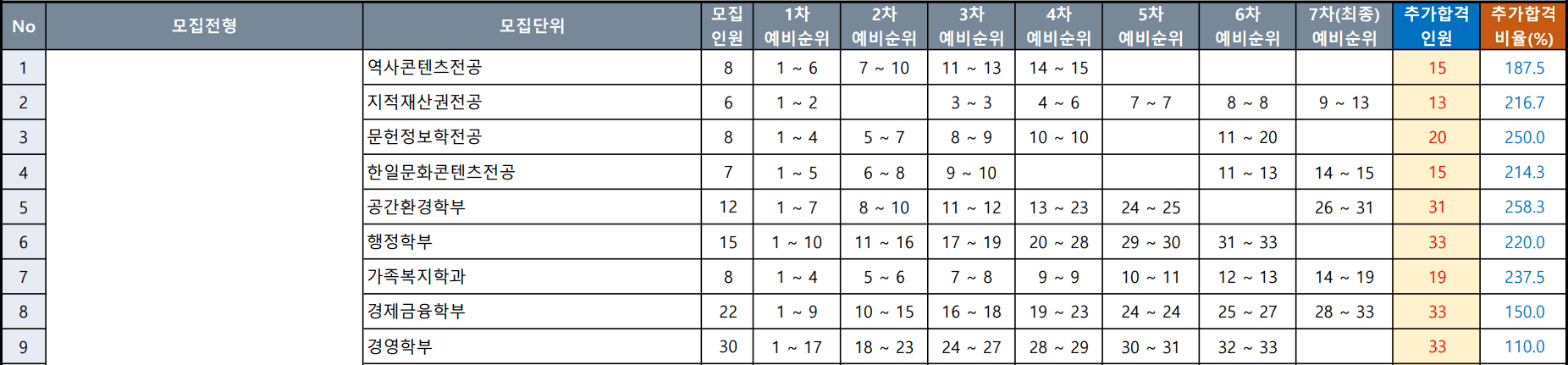 즉 흔히들 얘기하는 수시 예비번호라고 보시면 되고, 상명대 2024학년도 입결을 보면 역사콘텐츠전공 모집인원 8명이었는데 추가합격인원이 15라면 충원율은 (15/8)*100=187.5%입니다. 같은 방식으로 계산한다면 지적재산권전공은 216.7% 가 되는 겁니다.