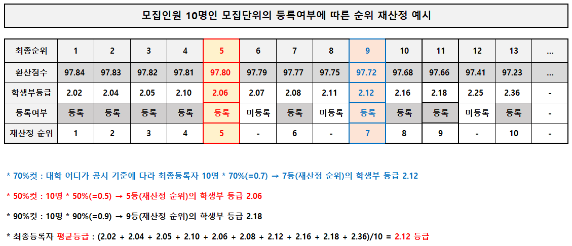 70%컷부터 보면 10명 중에 7등의 학생부 등급인데, 2명이 미등록을 하면서 재산정 순위 파란색 7위 학생의 등급인 2.12 가 되는 것이고 50%컷은 5등의 성적이니까 빨간색 5섯번째 학생의 등급인 2.06 가 되는 것입니다.