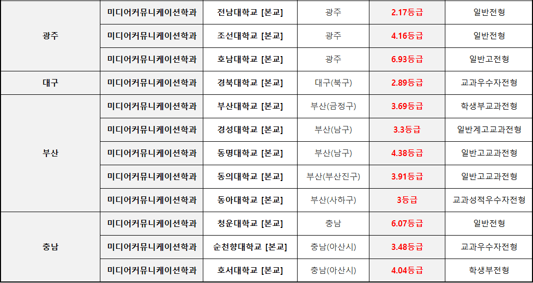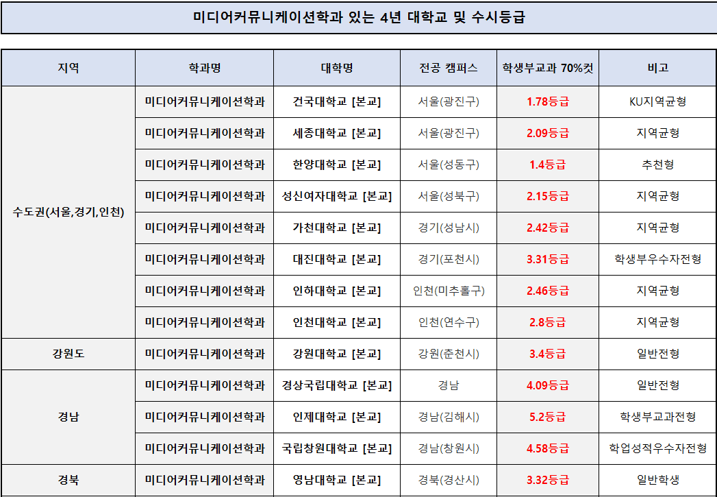 ▣ 미디어커뮤니케이션학과 대학 수시등급 순위 ▣