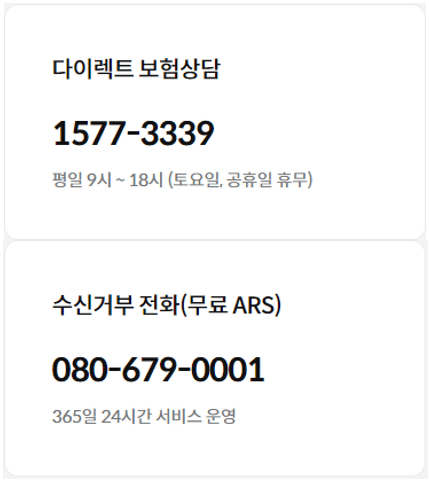 다음으로 다이렉트 고객센터 전화번호는 1577-3339, 장기보험 가입상담 1588-3339, 자동차보험 가입상담 1600-5008, 대출콜센터 1588-744 번으로 하시면 됩니다.