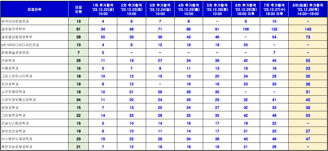 이 외에도 상명대 천안캠퍼스 수시 입결에는 2024학년도 수시등급 뿐 아니라 추가합격 예비순위에 대한 결과가 따로 정리되어 있는데 예를 들어 학생부교과 식품공학과 16명 모집에 최종 23번이 합격한 것으로 확인됩니다.
