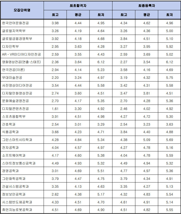 문화예술경영전공은 최고 2.46, 평균 3.52, 최저 3.87를 간호학과는 1.59, 2.72, 3.26등급을 식품공학과는 3.45, 3.95, 4.24등급을 그린스마트시티학과는 3.53, 4.36, 5.03등급이었습니다.