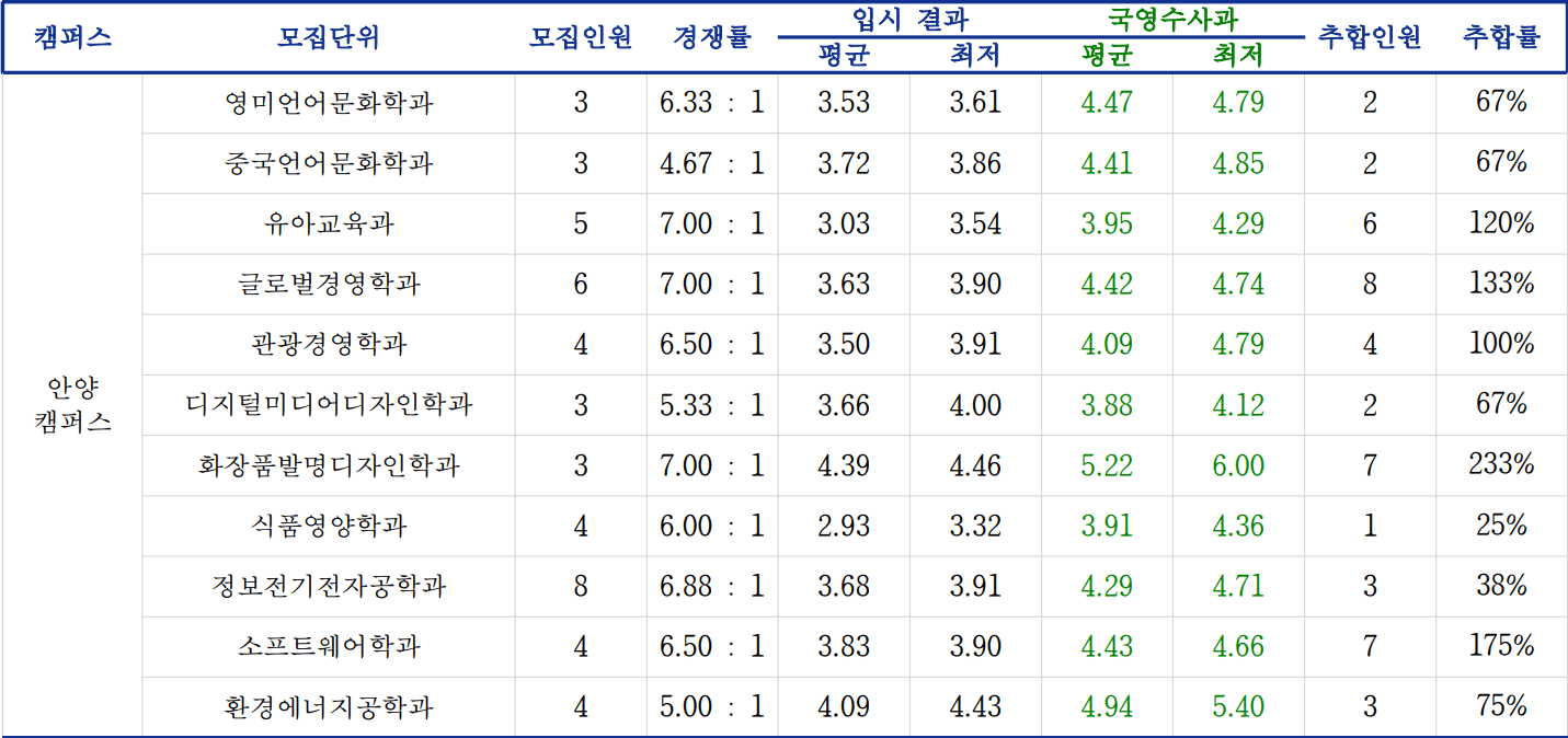 ▣ 안양대학교 수시등급 2024 입결 ▣
