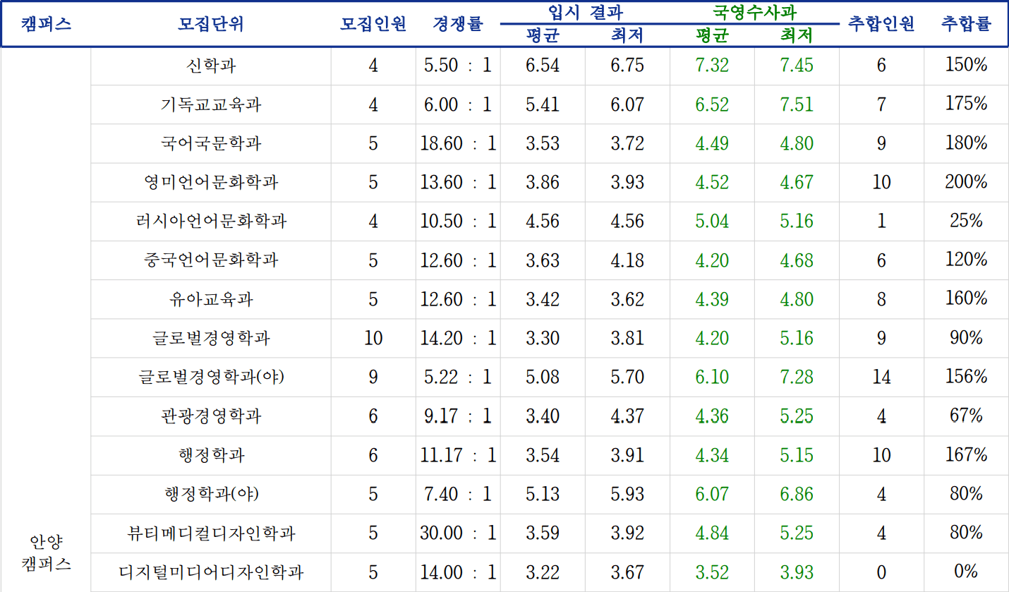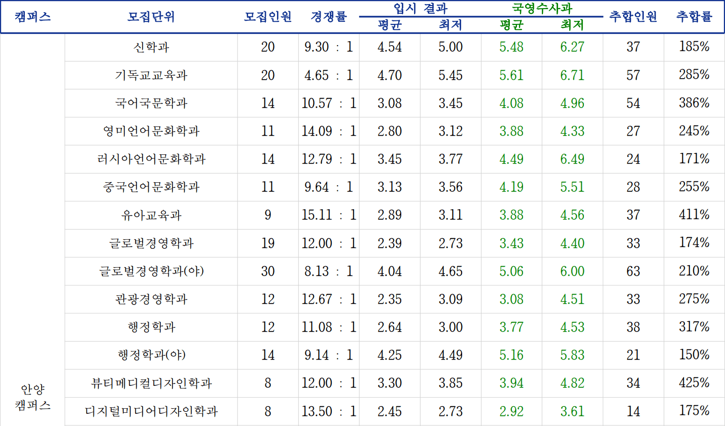 모집단위별 수시 입결을 보면 신학과는 20명 모집에 9.30:1 경쟁률에 평균 4.54등급에 추합번호 37번이 최종합격을 기독교교육과는 20명 모집에 4.65:1 에 4.70 에 57번이 국어국문학과는 14명 모집에 20.57:1 에 3.45등급에 54번이 합격이었습니다.