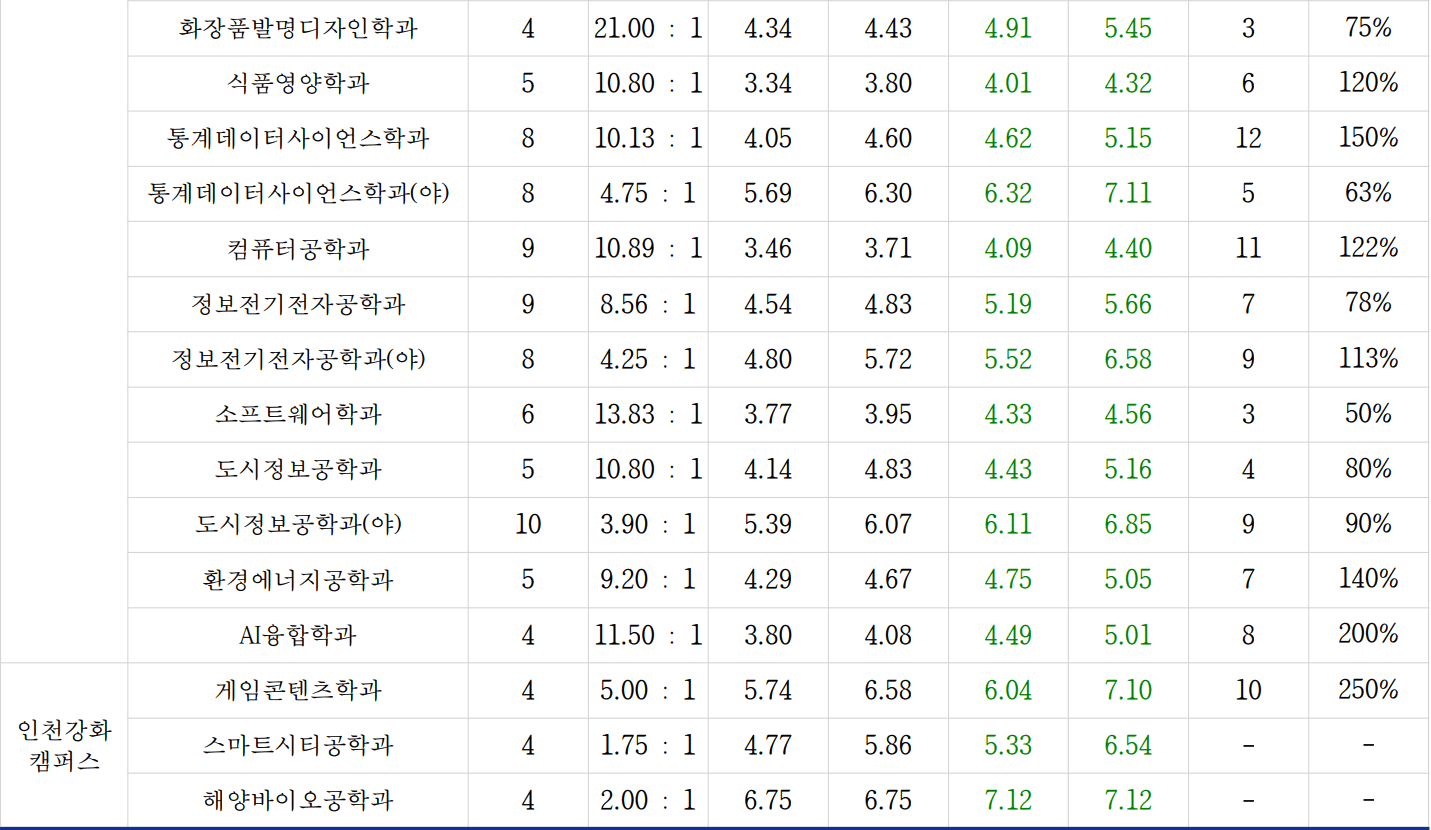 화장품발명디자인학과는 4명 모집에 21.00:1 경쟁률로 상당히 높았으며 4.34등급에 3번이 식품영양학과는 5명 모집에 10.80:1 에 3.34 에 6번이 통계데이터사이언스학과는 8명 모집에 10.13:1 에 평균 4.05등급에 12번이 합격이 처리되었습니다.