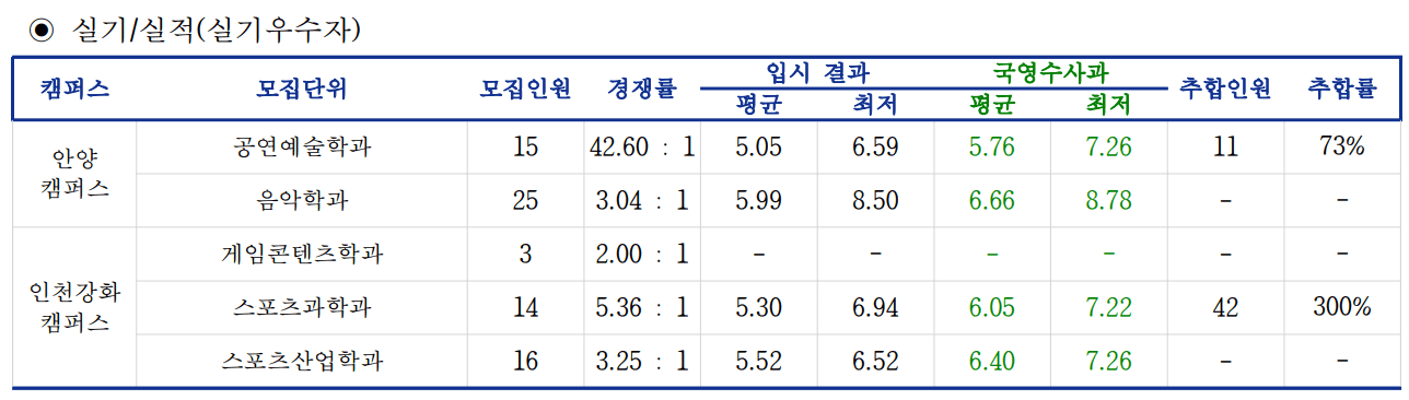 수시 입결은 공연예술학과는 15명 모집에 42.60:1 경쟁률에 평균 5.05등급에 추합번호 11번이 음악학과는 25명 모집에 3.04:1 에 5.99등급에 스포츠과학과는 14명 모집에 5.36:1 에 5.30에 42번이 최종합격이었습니다.