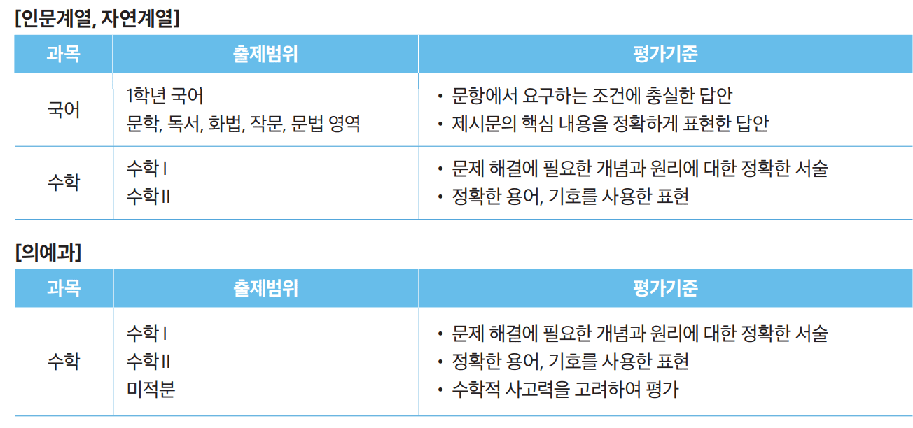 인문/자연계열 국어 출제범위는 1학년 국어 문학, 독서, 화법, 작문, 문법 영역에 평가기준은 문항에서 요구하는 조건에 충실한 답안과 제시문의 핵심 내용을 정확하게 표현한 답안입니다.