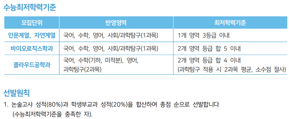 인문/자연계열은 국어, 수학, 영어, 사회/과학(1과목) 중 1개 영역 3등급 이내, 바이오로직스학과 2개 영역 등급 합5 이내, 클라우드공학과 수학(미적분, 기하), 과학탐구(2과목) 2개영역 등급 합4이네, 의예과 동일한 영역에 3개 영역 각 1등급으로 확인됩니다.
