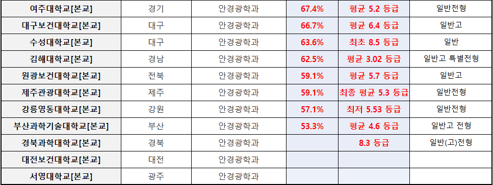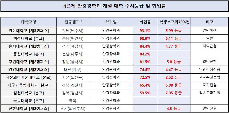 ▣ 전국 4년제 안경광학과 대학 수시등급 및 취업률 순위 ▣