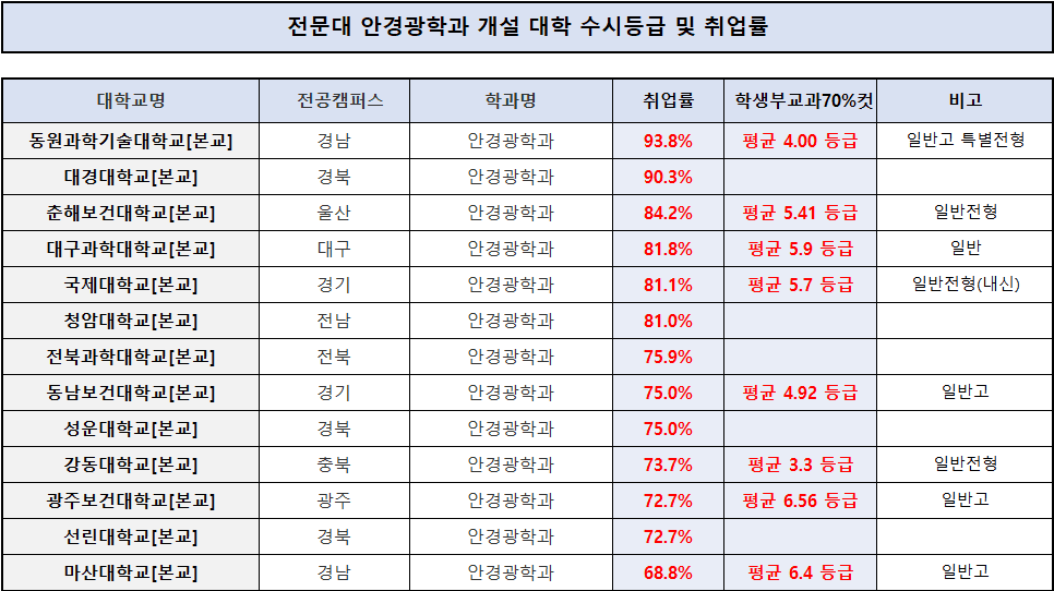 ▣ 전문대 안경광학과 대학 순위 (수시등급 및 취업률) ▣