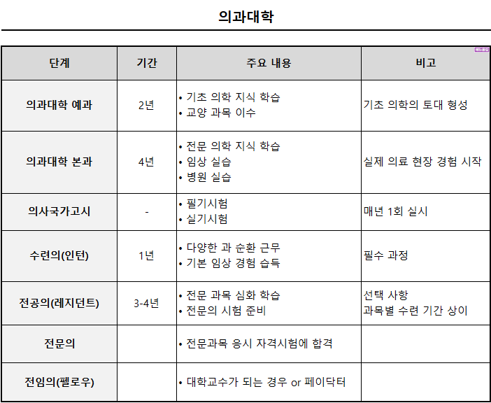 본론으로 들어가기 전 우리나라에서 현재까지 의사가 되는 방법은 의과대학에 진학해 예과 2년, 본과 4년을 보낸 후 의사국가고시 시험을 보고 합격해야 하며 이후 수련의 즉 인턴 1년을 마치면 일반의로 이후 전공의 (레지던트), 전문의, 전임의(펠로우) 과정을 순차적으로 진행하면 됩니다.