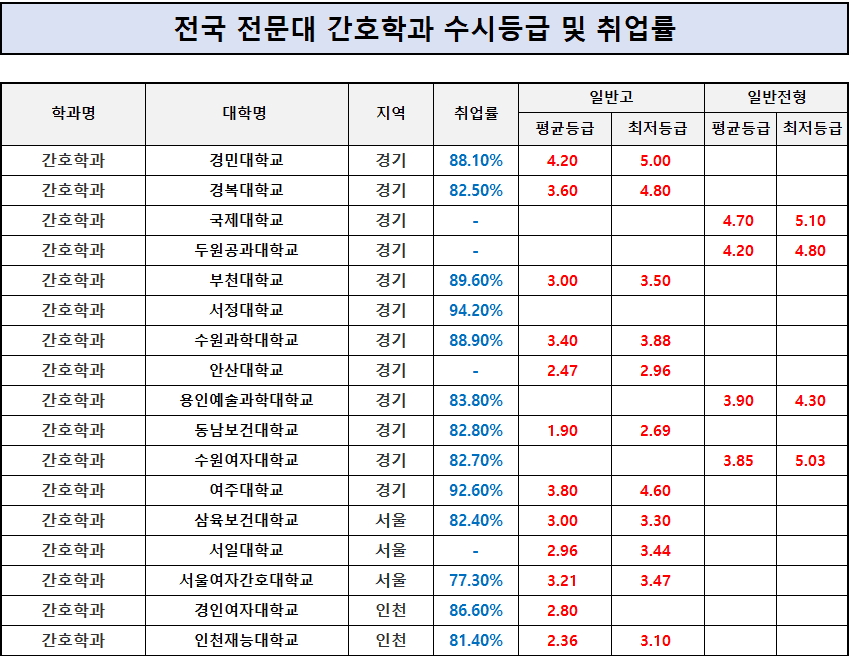 위의 첨부한 이미지를 참고하면 어느 지역에 어떤 전문대에 간호학과가 개설되어 있는지와 그 대학에 수시1차 일반고 또는 일반전형에 대한 전문대 간호학과 수시등급과 취업률을 확인할 수 있어 진로를 정하는데 많은 도움이 될 것으로 기대합니다.