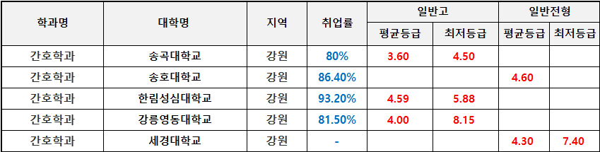 전국 전문대 간호학과 수시등급 및 취업률 비교