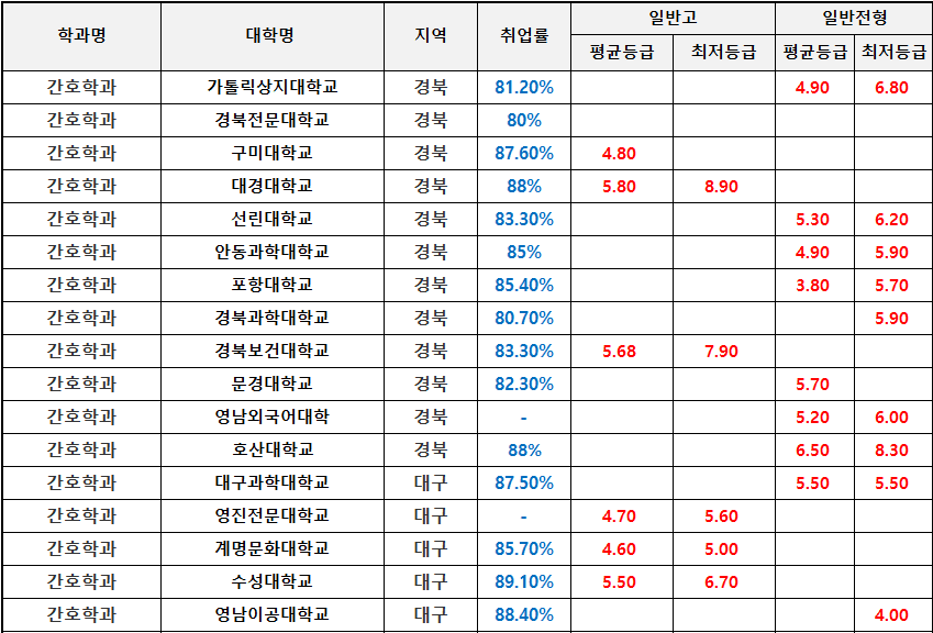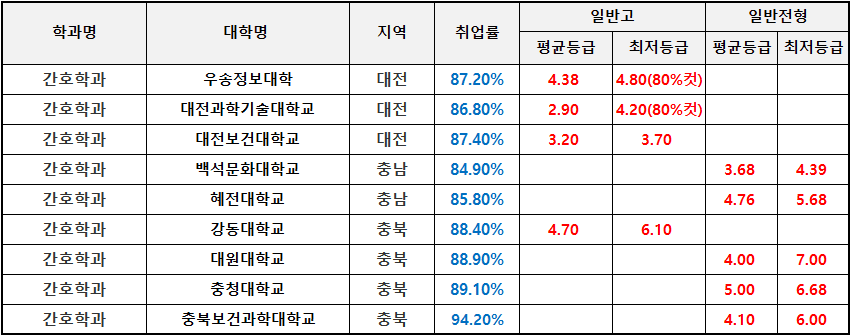 위의 첨부한 이미지를 참고하면 어느 지역에 어떤 전문대에 간호학과가 개설되어 있는지와 그 대학에 수시1차 일반고 또는 일반전형에 대한 전문대 간호학과 수시등급과 취업률을 확인할 수 있어 진로를 정하는데 많은 도움이 될 것으로 기대합니다.