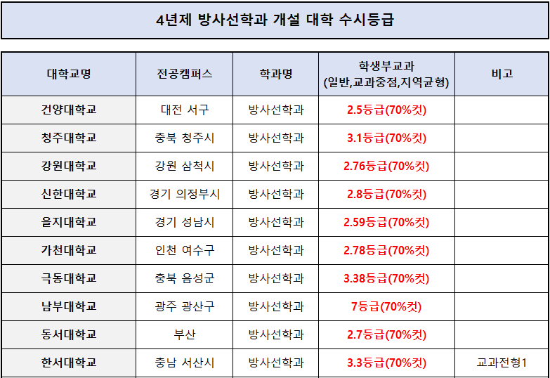 그리고 주요 방사선학과 대학들의 수시등급을 보면 강원대학교 학생부교과 일반전형 70%컷은 2.76등급, 연세대 미래캠은 2.61등급, 을지대학교는 2.59등급 등으로 확인되며 김천대는 5.9등급컷으로 확인이 되는데, 본인이 정확한 내신을 알고 싶다면 가고자 하는 대학 입학홈페이지에 그 대학에 맞는 내신 산출해 보시기 바랍니다.