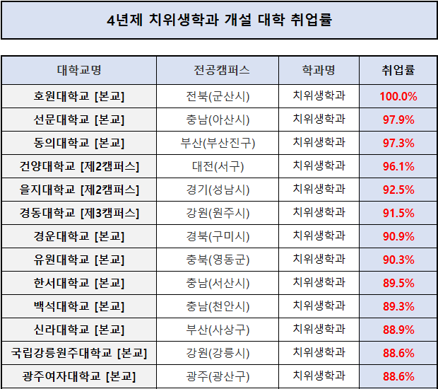 대학이나 전공을 선택할 때 학생들마다 기준이 있겠지만 치위생사가 되기 위해 치위생학과 대학 순위만을 찾는 경우를 보게 되는데 거기에 취업률까지 포함한다면 후회 없는 선택이 될 수 있을 겁니다.