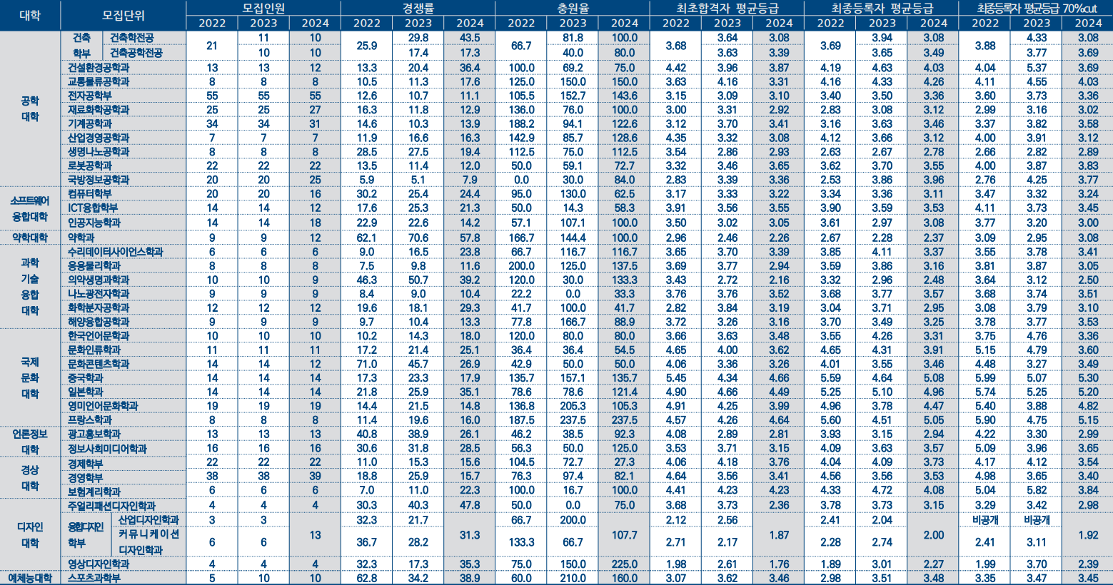 다음으로는 주얼리패션디자인학과 4명 모집에 47.8:1를 가장 낮은 경쟁률을 보인 학과는 전자공학부로 55명 모집에 11.1:1에 평균, 70% 컷 모두 3.36등급으로 확인이 됩니다.