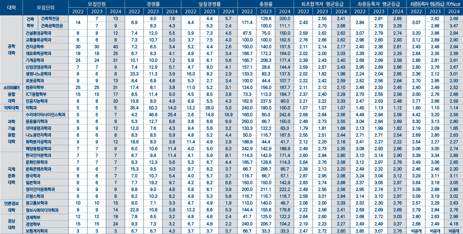 다음으로는 주얼리패션디자인학과 4명 모집에 47.8:1를 가장 낮은 경쟁률을 보인 학과는 전자공학부로 55명 모집에 11.1:1에 평균, 70% 컷 모두 3.36등급으로 확인이 됩니다.