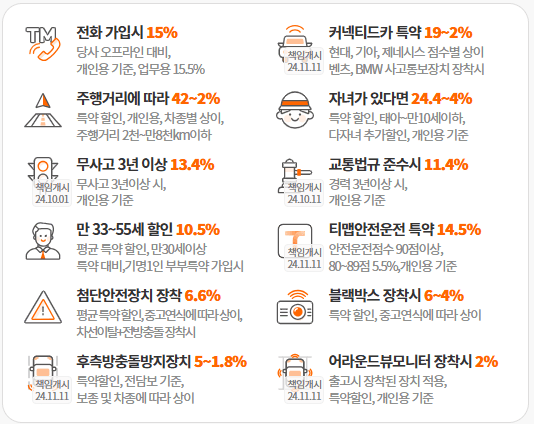 자녀할인 특약 : 만10세 이하 자녀가 있다면 특약보험료를 제외한 적용 보험료에서 24.4%~4% 할인을 더 받으실 수 있습니다.