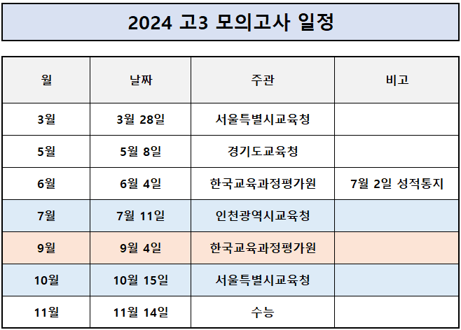 지금 시기 고3 이라면 기말고사로 준비로 바쁘텐데요, 6월 모의고사가 얼마 전 끝이 났는데 앞으로 남은 2024 모의고사 일정은 7월, 9월, 10월 이렇게 3번이 남아 있어 출제영역 시험 범위에 9월 신청기간에 대해 한꺼번에 정리해 안내하고자 합니다.