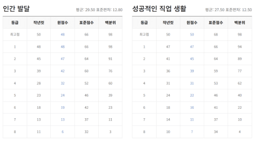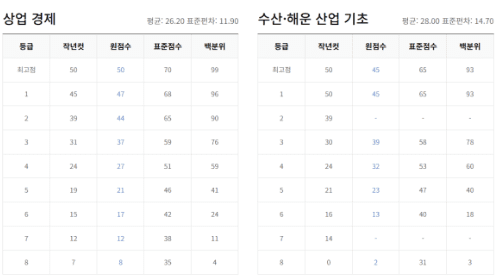 농업기초기술, 공업 일반, 상업 경제, 수산·해운 산업 기초, 인간발달, 성공적인 직업생활에 대한 수능 등급컷이 공개 되어 있습니다.