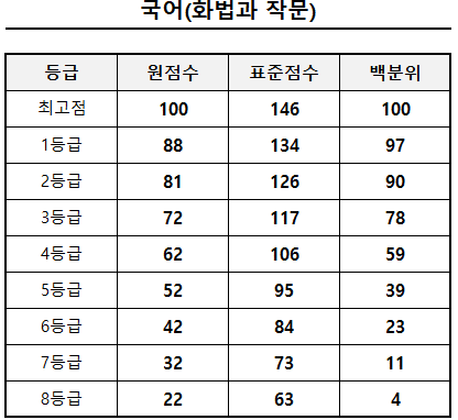 화법과 작문 등급컷은 표준점수 134, 백분위 97, 원점수 88 이 1등급컷을 원점수 88, 표준점수 126, 백분위 90이 2등급 결과였습니다.