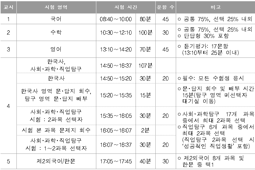 이며 4교시의 경우 한국사를 30분 본 후 15분간 답지회수 및 탐구 영역 문제 배부하며 사회/과학/직업탐구 2과목 선택자 30분 시험을 본 후 문제지 회수하는 과정으로 운영하게 됩니다.