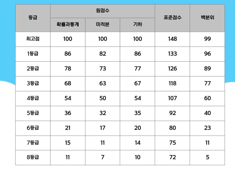 | 구분 | 원점수 기준 1등급컷 | 원점수 기준 2등급컷 | 표준점수 1등급컷 |