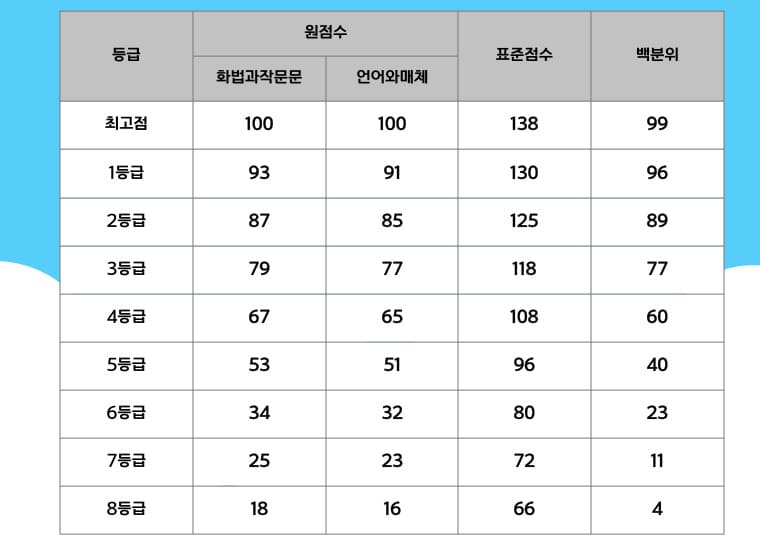 구분 원점수 기준 1등급컷 원점수 기준 2등급컷 표준점수 1등급컷