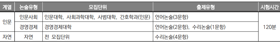 경영경제 : 경영경제대학 – 언어논술(2문항), 수리논술(1문항)