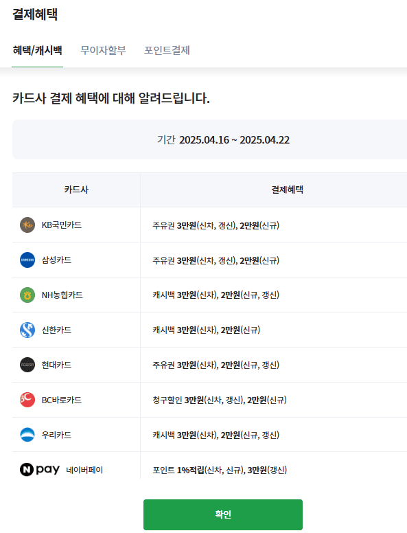 4) 주유권 혜택 : 카드사별 주유권 3만원, 캐시백 3만원, 청구할인 3만원 헤택