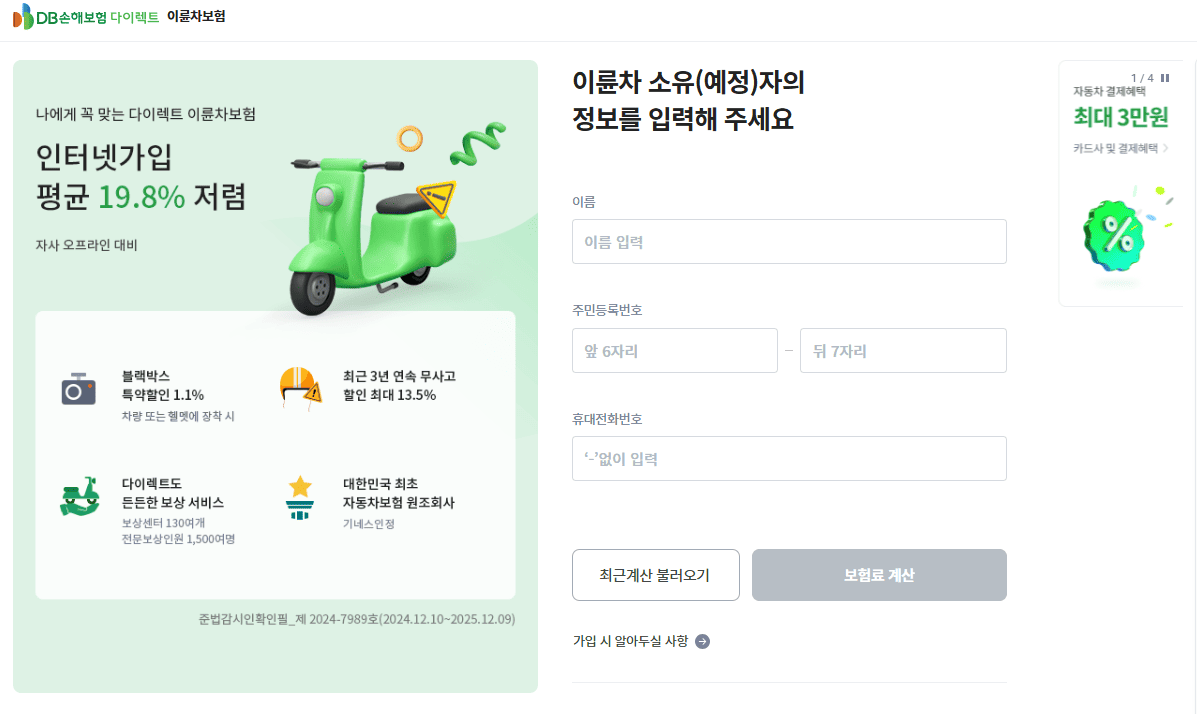 DB 이륜차보험 다이렉트 보험료 계산하기