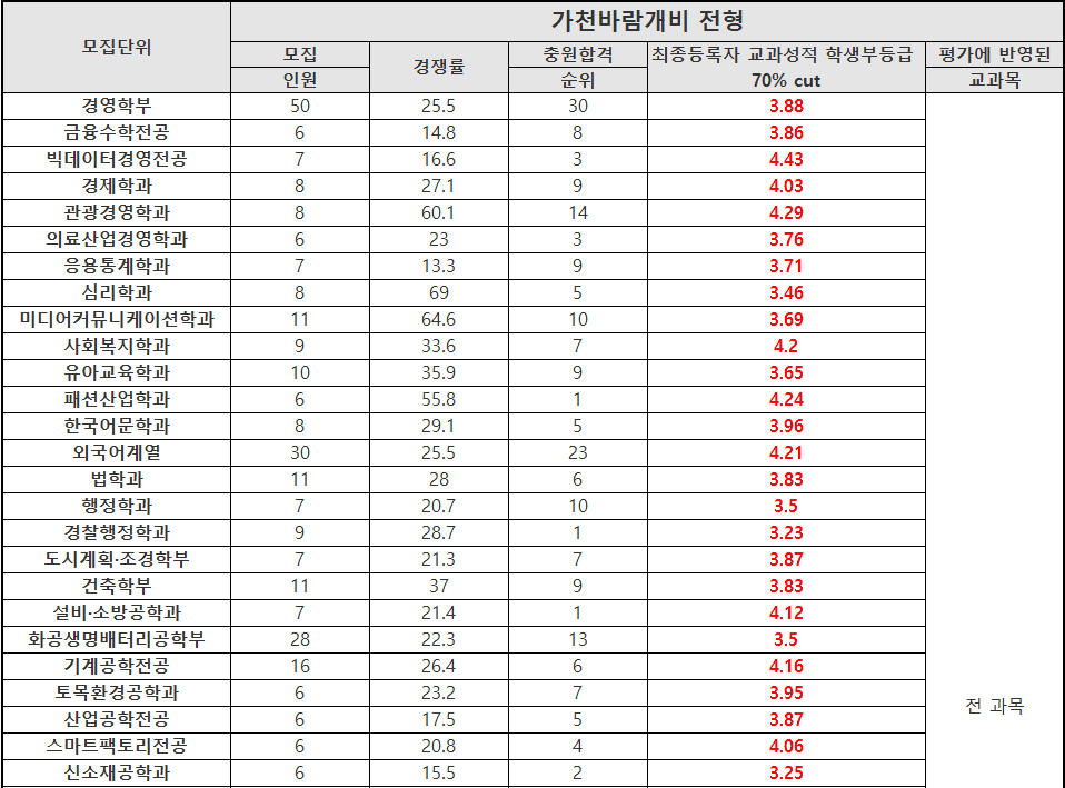 경영학부는 18명 모집에 209명이 지원해 11.6:1 에 3.04, 3.18등급에 31번이 회계세무학전공은 7명 모집에 7.9:1 에 3.45, 3.54등급 추합 4번이 최종 합격이었습니다.