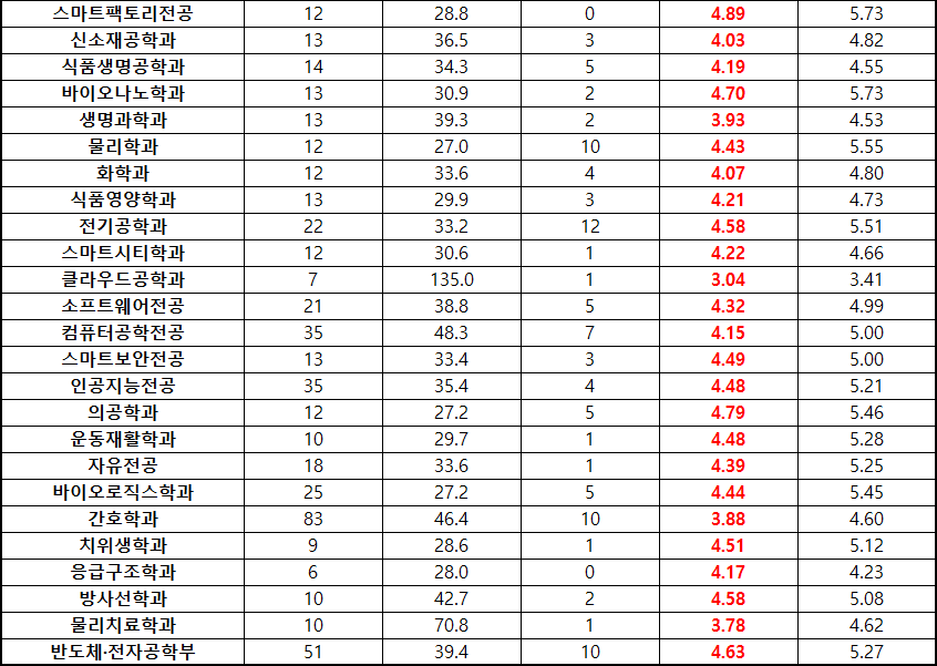 컴퓨터공학전공은 35명 모집에 48.3:1 에 4.15, 5.00등급에 7번이 스마트보안전공은 13명 모집에 33.4:1 에 4.49, 5.00 에 7번이 인공지능전공은 35명 모집에 35.4:1 에 4.48, 5.21등급에 추합 예비순위 4번이 합격이었습니다.